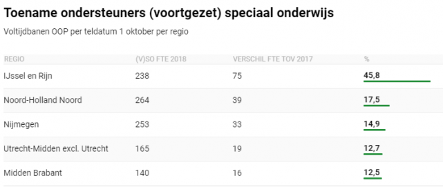 Een kwart van de (v)so-regio's laat juist een oop-krimp zien. Soms gaat het om een paar fte, soms om tientallen. Aan de onderkant van de lijst hebben regio’s als de Achterhoek, Rijnmond en Twente beduidend minder ondersteuners in huis, aldus de DUO-gegevens. Een deel van de verklaring is waarschijnlijk dat in een aantal van deze regio’s het (v)so sowieso flink in omvang is gekrompen.